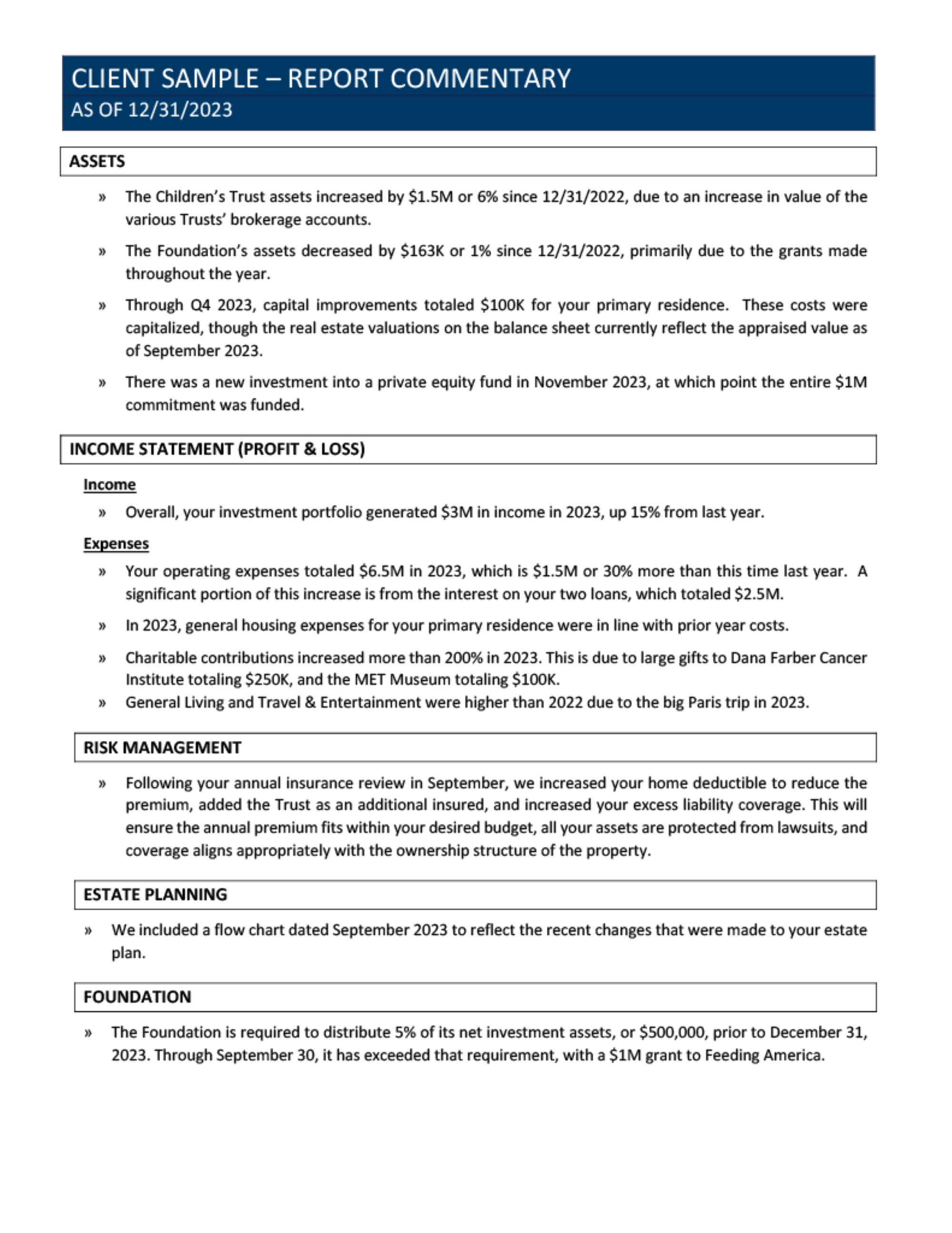 We don’t just provide data. Our customized analysis goes beyond the numbers to provide meaningful insights for your family. We ask questions, identify priorities, and work with your team to address open items. Our knowledge of your family’s financial and personal situation helps us identify risks, trends, and opportunities.